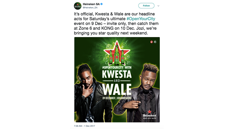 Having recently collaborated with Multi-award winning rapper Kwesta on the hit single “Spirit”, the two rappers are set to perform at the Heineken’sย #OpenYourCity INVITE-ONLY event taking place in Johannesburg on Saturday, 09 December 2017.