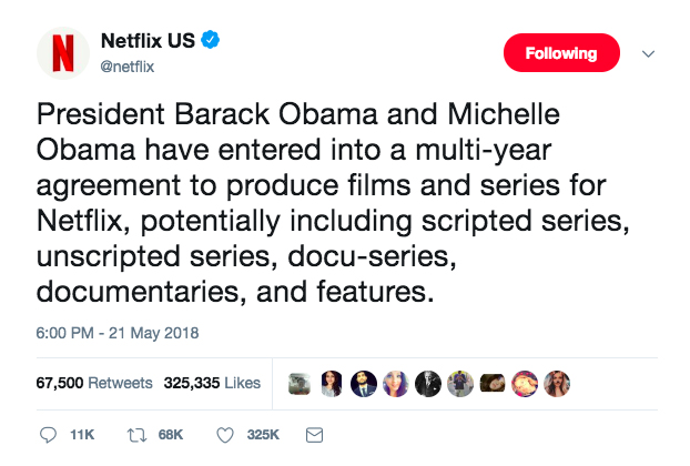According to Netflix,ย the Obamas will produce a diverse mix of content, including the potential for scripted series, unscripted series, docu-series, documentaries and features. These projects will be available to the 125 million-member Netflix households in 190 countries.