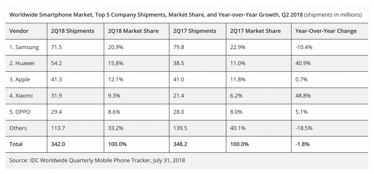 Huawei has topped Apple to become the world’s second largest smartphone manufacturer. Worldwide Quarterly Mobile Phone Tracker shows that 342 million smartphones were shipped in the second quarter of 2018, a 1.8% decline year over year.