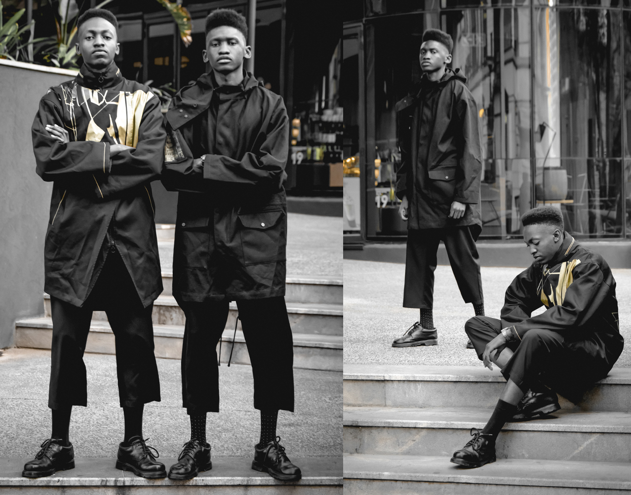 Rich Mnisi’s jacket carries the gold and black theme using creative patterns and neat look. The jacket features a wide pattern in the front with sleeves and two pockets on each side. The lower back is a pocket with a belt hanging over and covered with numbers and words pattern. The top part is written CALL ME in bold and large.