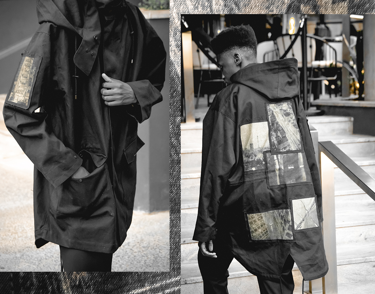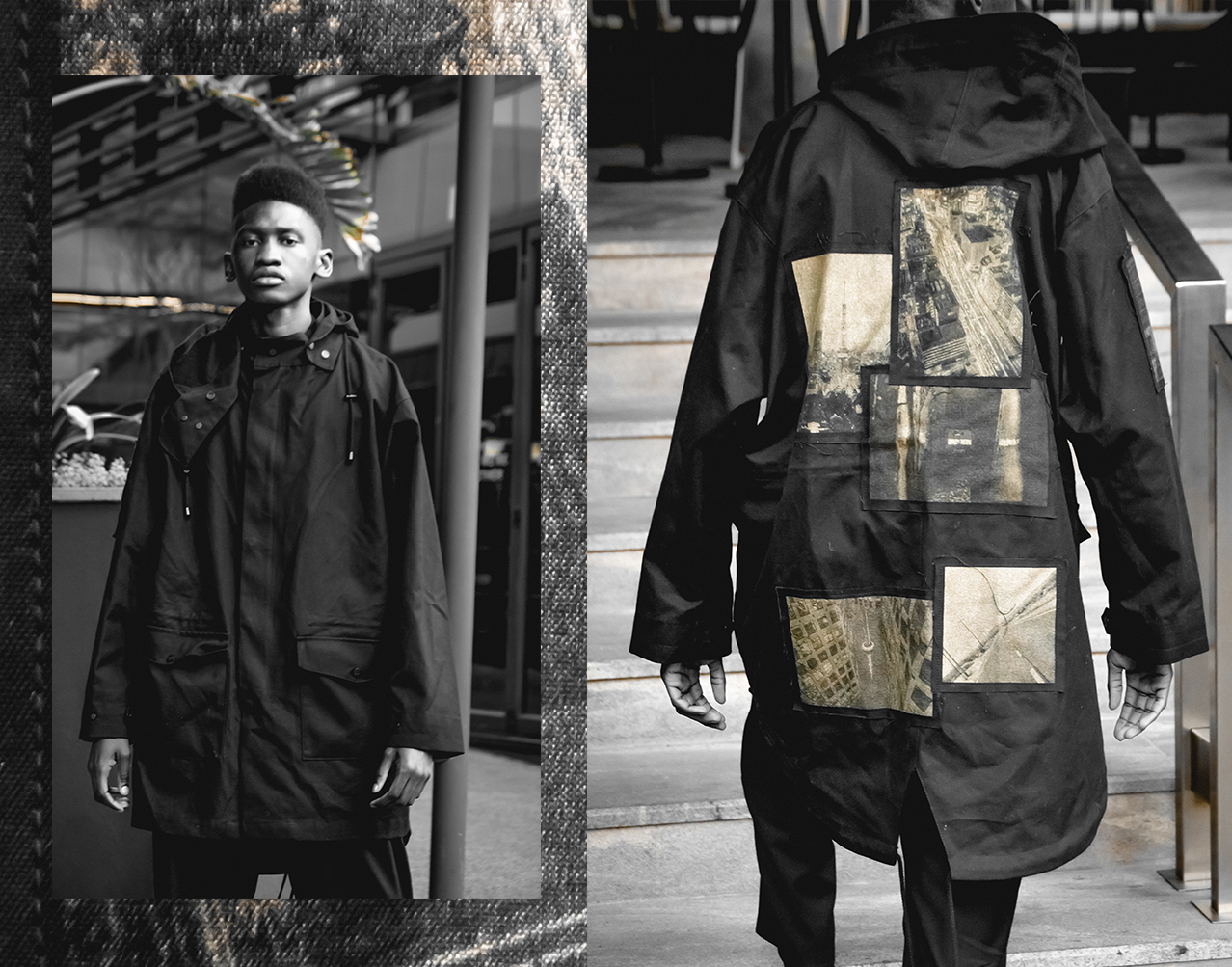 Elie Kimbembe who’s a forward-thinking photographer takes his work to make it part of the design in a unique way. The knee-length jacket shows Elie’s photography work on the front lower pocket and the entire back.