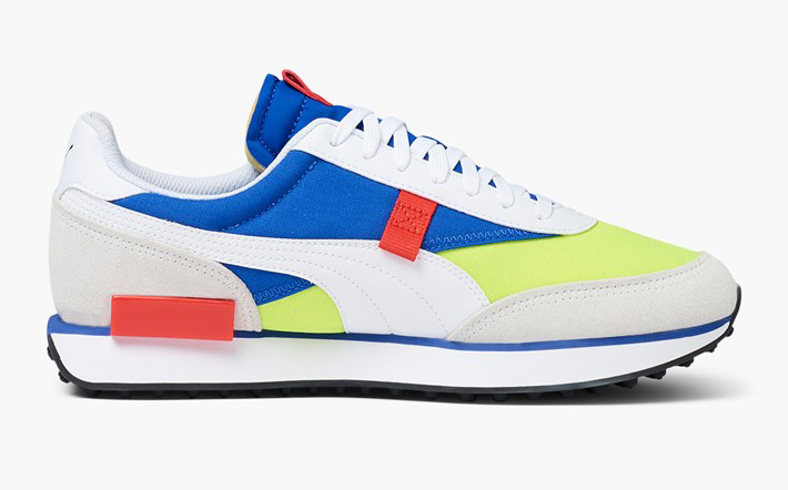 The Future Rider, which launched at the end of last year, is a revamp on the Fast Rider, a comfortable and super-light running shoe from 1980. The new model stays close to the original’s design, keeping the mixed leather and suede upper and adding an updated slimmer outsole made of comfortable Rider Foam. The colorways continue the future-meets-retro spirit of the franchise, bringing ’80s-reminiscent pops of color to the running silhouette.