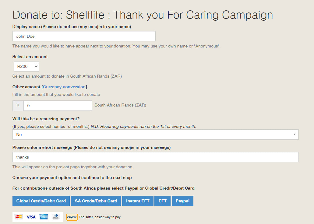 PLEASE NOTE: You must use the matching name and email address from your Shelflife online profile when donating to ensure the payment reference is correct and can be allocated to my entry. DO NOT DONATE ANONYMOUSLY IT CANNOT BE LINKED TO YOUR ENTRY IN THAT CASE.