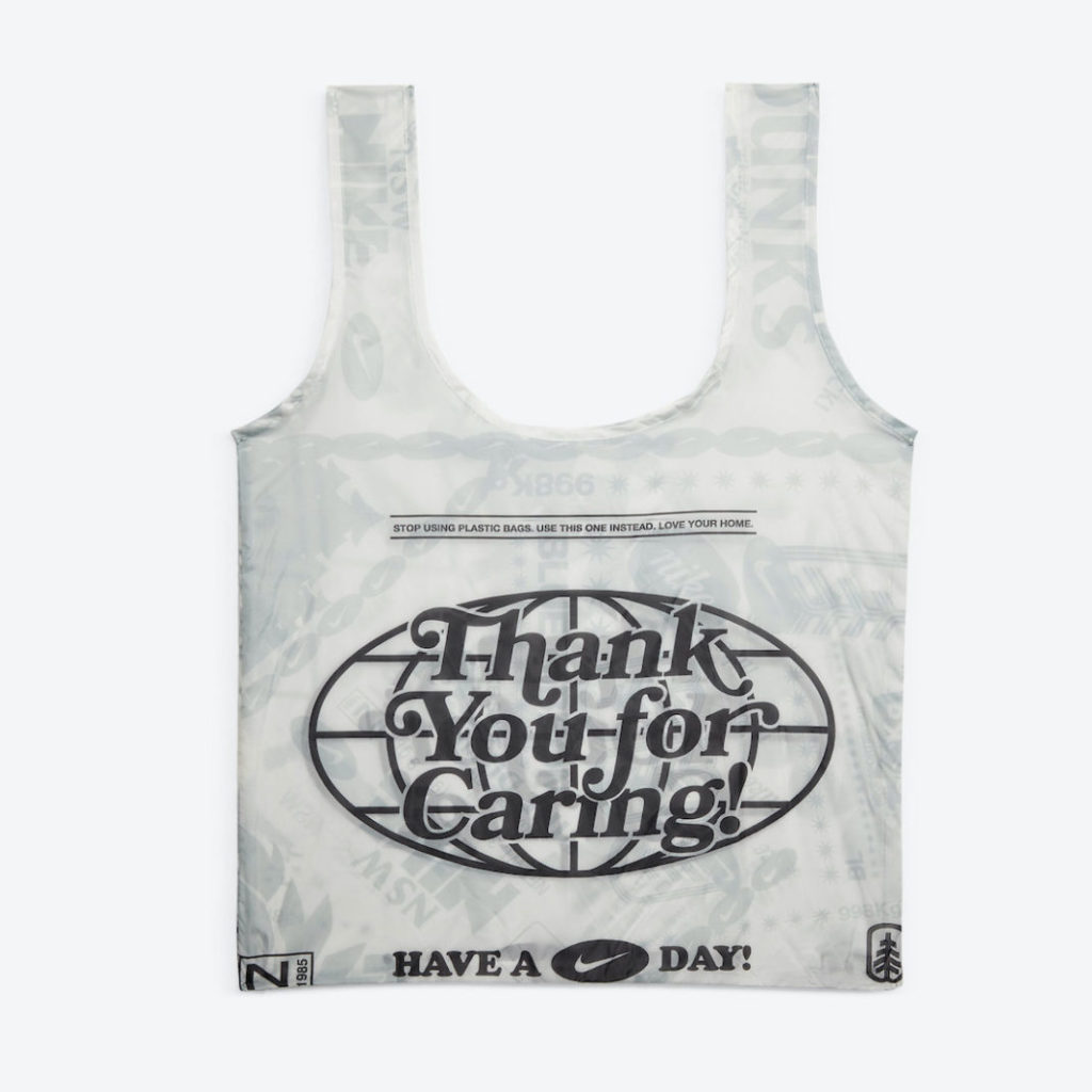 On the tongue, a small, zipped compartment nod to reusable grocery storage, with its accompanying tag re-imagined to resemble a nutrition facts label. Finally, an accompanying grocery bag pays its respects with a simple commendation: “Thank You For Caring!”