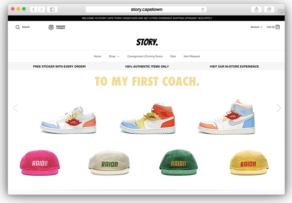 Story is a premium sneaker, streetwear, and collectible consignment store in Cape Town as well as online. Story has quickly become one of the biggest names in Cape Town, headed by Chris Jack and Lukas J Marais. Their premium space houses a variety of sneakers, rare apparel pieces, and accessories.