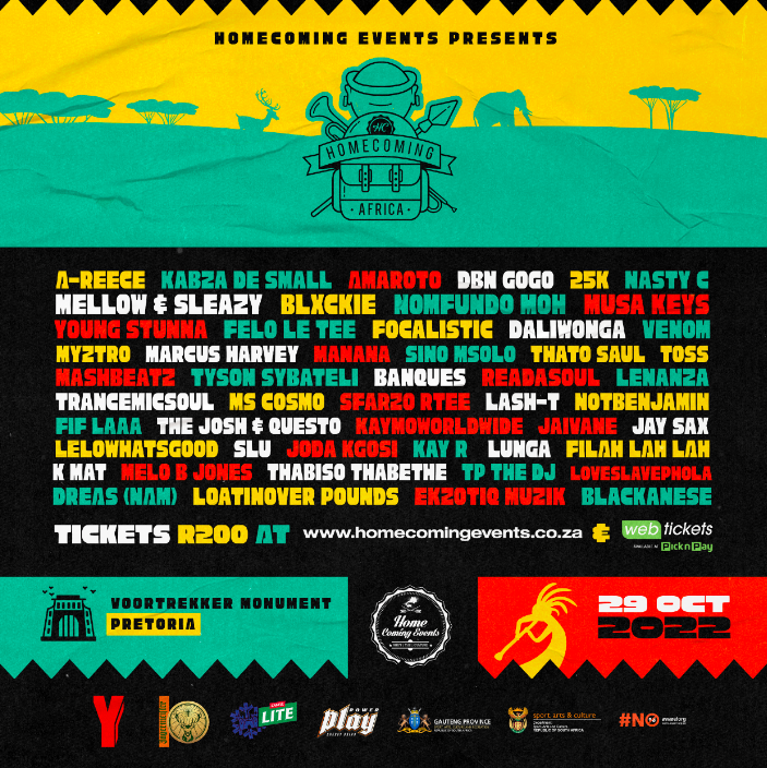The festival will take place on 29 October 2022 with a jam packed line-up which includes headliners; A-Reece, Kabza De Small, Amaroto, DBN Gogo, 25k, Nasty C, Mellow & Sleazy, Blxckie, Nomfundo Moh, Musa Keys, Young Stunna, Felo Le Tee, Focalistic, Daliwonga, Venom, Myztro, Marcus Harvey, Manana, Sino Msolo, Thato Saul, Toss, Mashbeatz, Tyson Sybateli, Banques, Readasoul, Lenanza, Trancemicsoul, Ms Cosmo, Sfarzo Rtee, Lash-T, Notbenjamin, Lelowhatsgood, Slu, Joda Kgosi, Kay R, Lunga, Filah Lah Lah, K Mat, Melo B Jones, Thabiso Thabethe, TP the DJ, Loveslavephola, Dreas, Loatinover Pounds, Ekzotiq Muzik, and Blackanese.