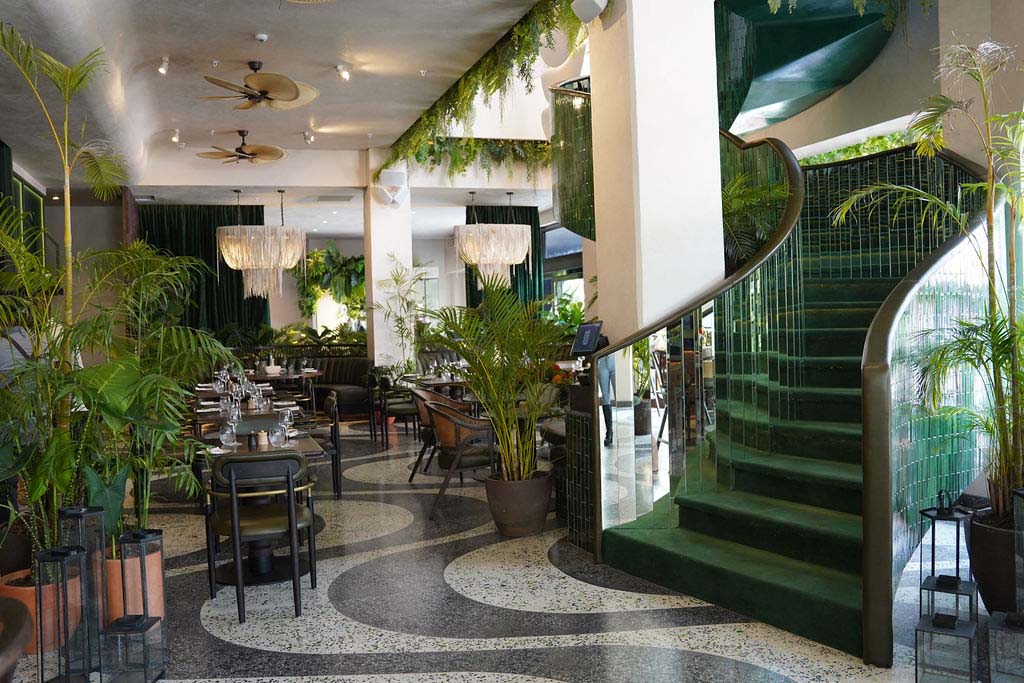 Just entering the first floor, you’re greeted by the shades of green and the bright look of the restaurant, open kitchen, and well-designed circular bar.
