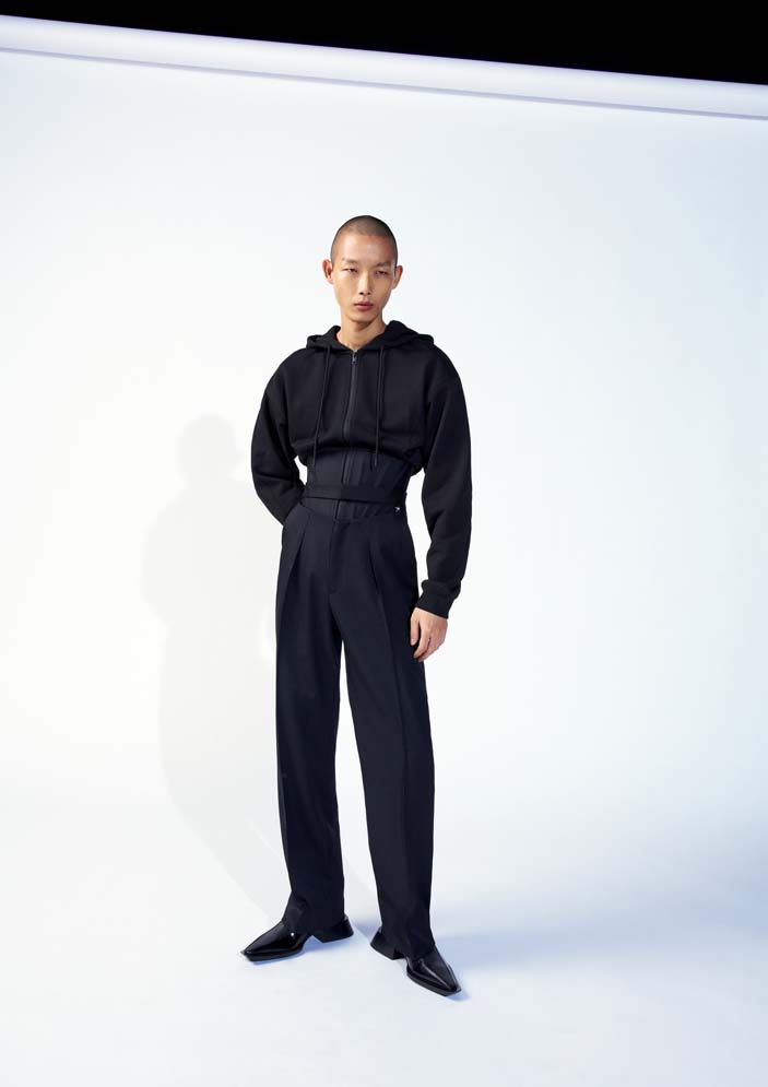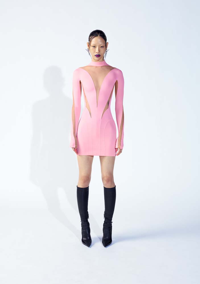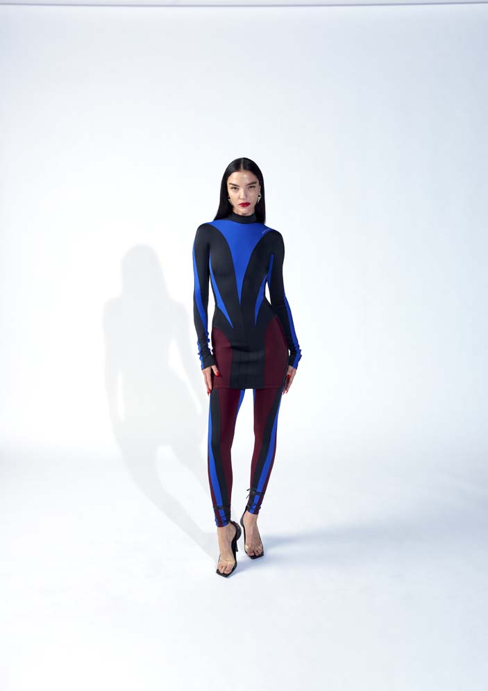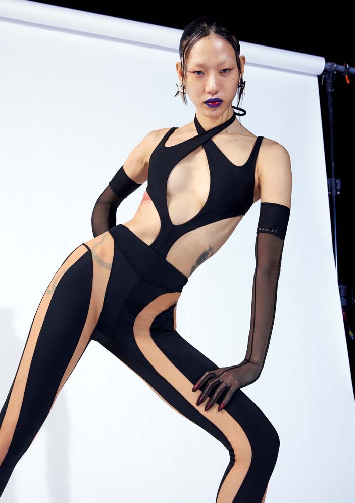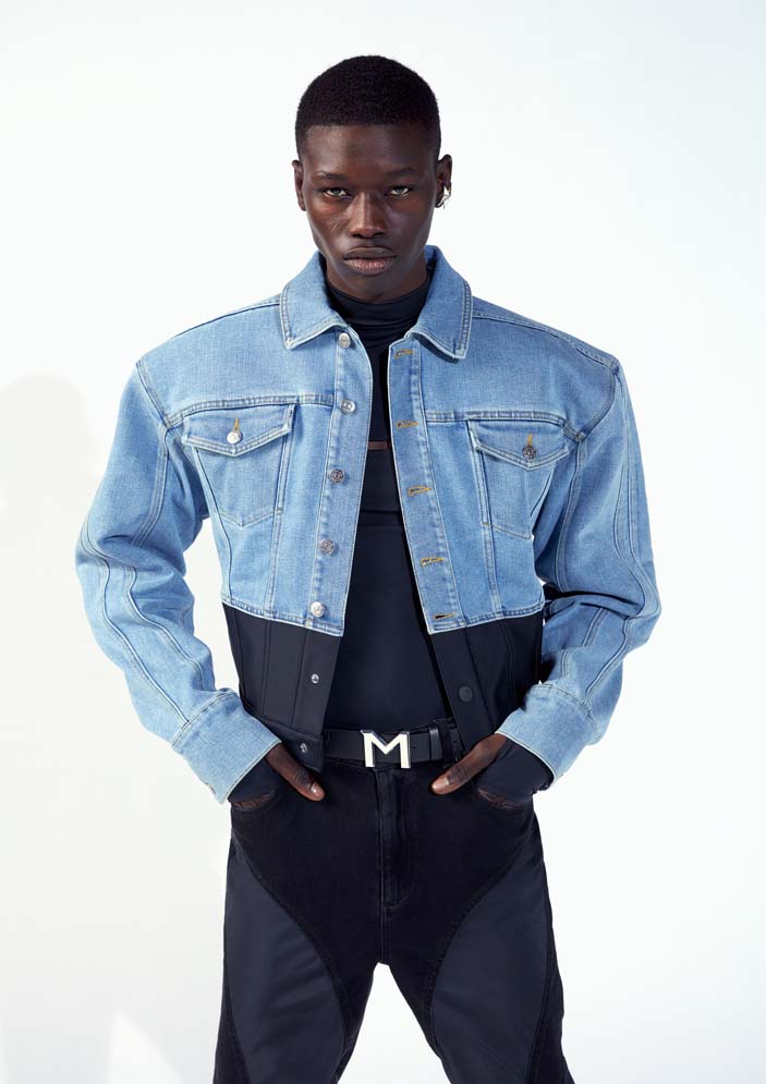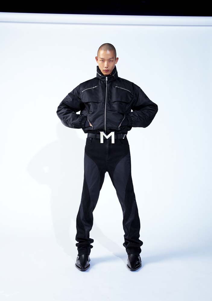 The womenswear styles include signature Mugler oversized shoulders with a cinched waist shaping the body. Modern expression of the house codes, the spiral multi-seaming runs throughout the collection in the form of baggy jeans, nylon and denim bonded thong jeans, and jackets. Leather trench coats and jackets with an elongated scarf detailing, strong tailoring is accompanied by the illusion catsuits, leggings, cut-out bodysuits, dresses with decadent embellishments.
