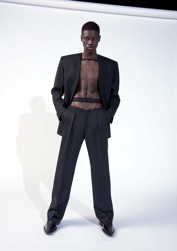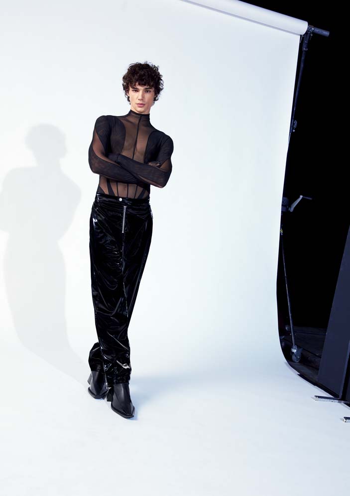 The menswear assortment features a collective of leather styles including trousers, blazers, and a trench coat with engraved buttons. The denim selection includes a sculpted jacket with padding that accentuates the form. Sharp tailoring can be layered with see-through flocked star prints and corseted tank tops.