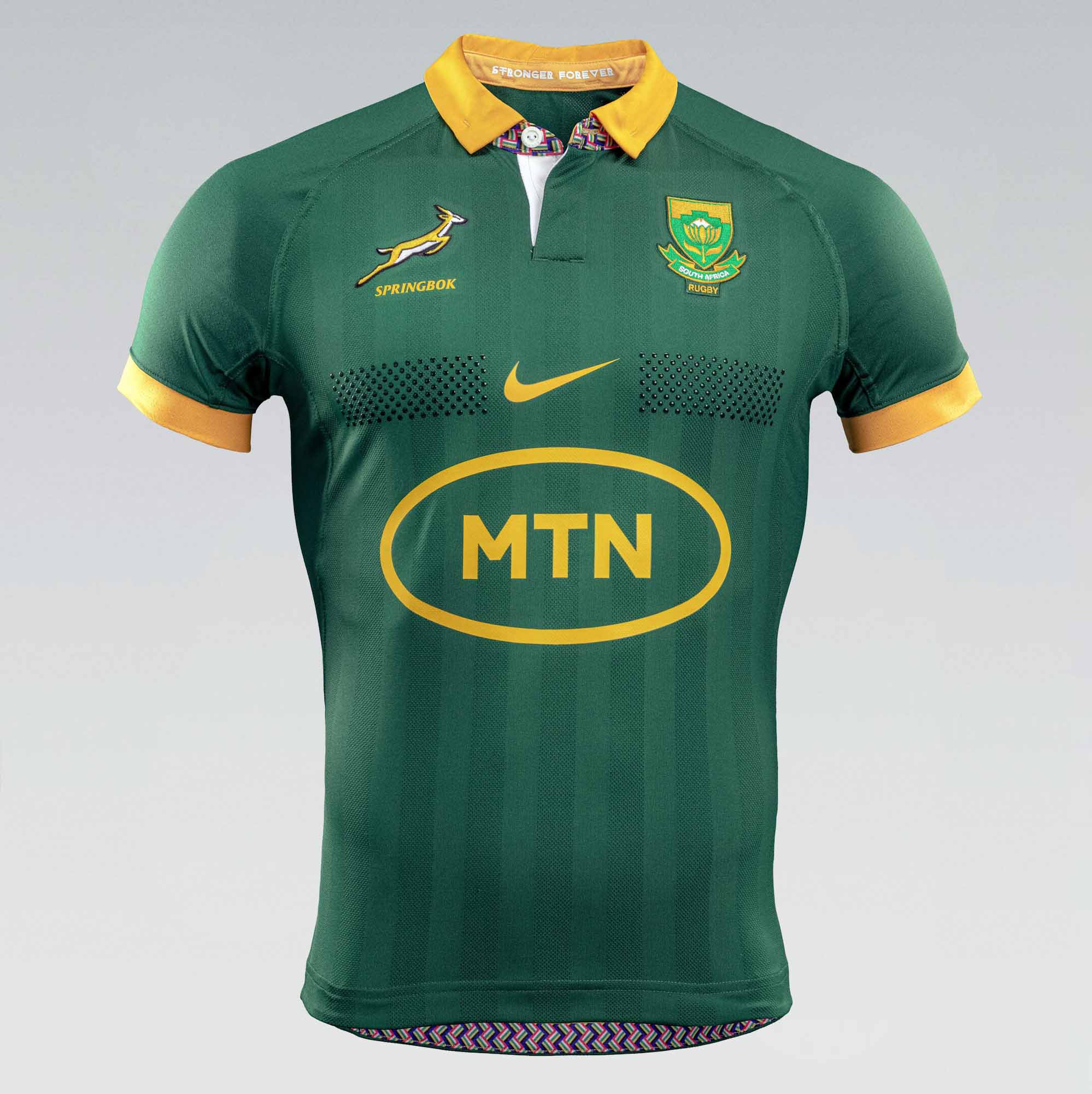 In terms of design, the classic ‘green and gold’ jersey has been reimagined to include a traditional collar with the underside of the collar giving a nod to the South African flag. As an acknowledgment of the team’s spirit, the phrase “Stronger Forever” is inscribed on the inside collar.