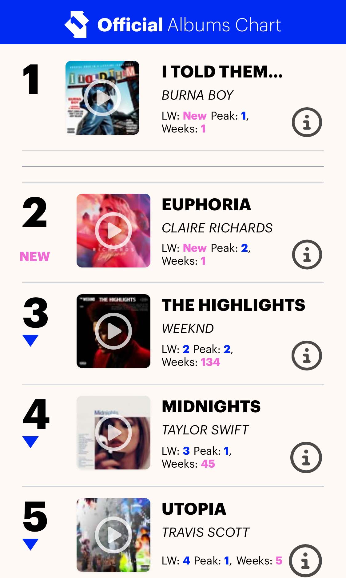 The Official Charts company confirmed on Friday that Burna Boy’s seventh studio album, “I Told Them,” debuted at number 1 this week (1 September 2023 – 7 September 2023) on the UK albums chart.