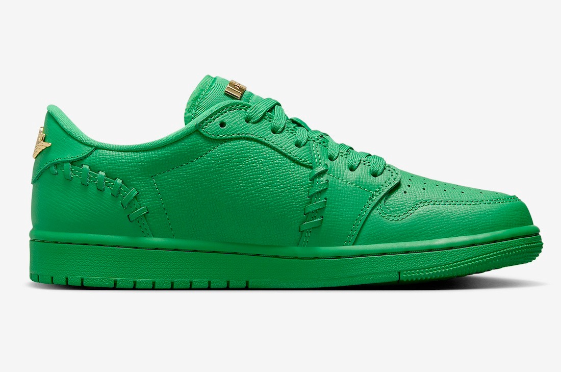 Adorned in Bottega Green, this Air Jordan 1 Low MM showcases a premium leather upper featuring reptile-inspired textures. Crafted with artisanal flair, baseball-style stitching graces the toe box and heel, accompanied by coordinated Green soles for a unified, monochromatic appeal. Adding a hint of luxury, the opulent ensemble is rounded off with a Gold-plated jewel Swoosh, Wings logo, and a tongue nameplate.