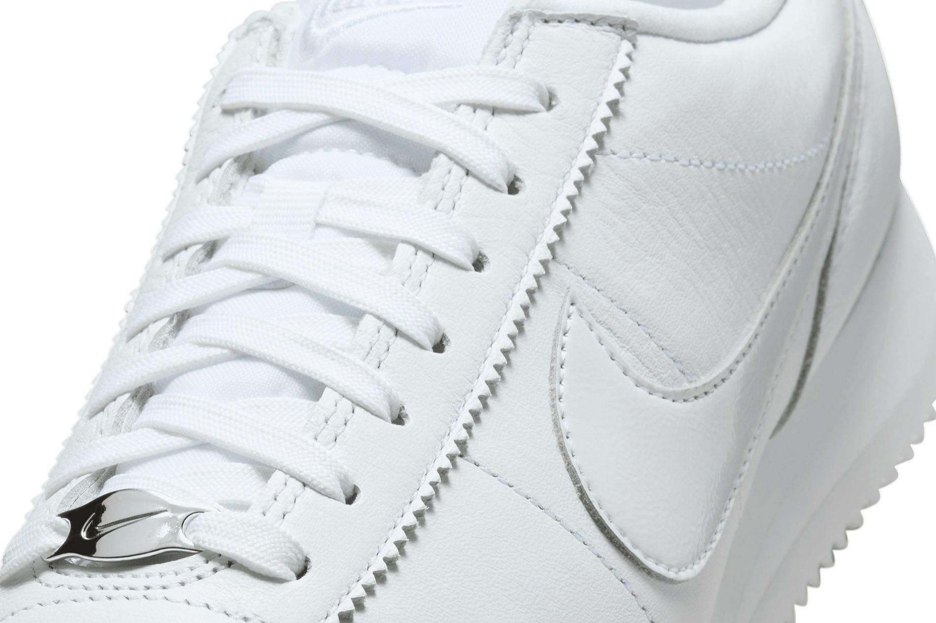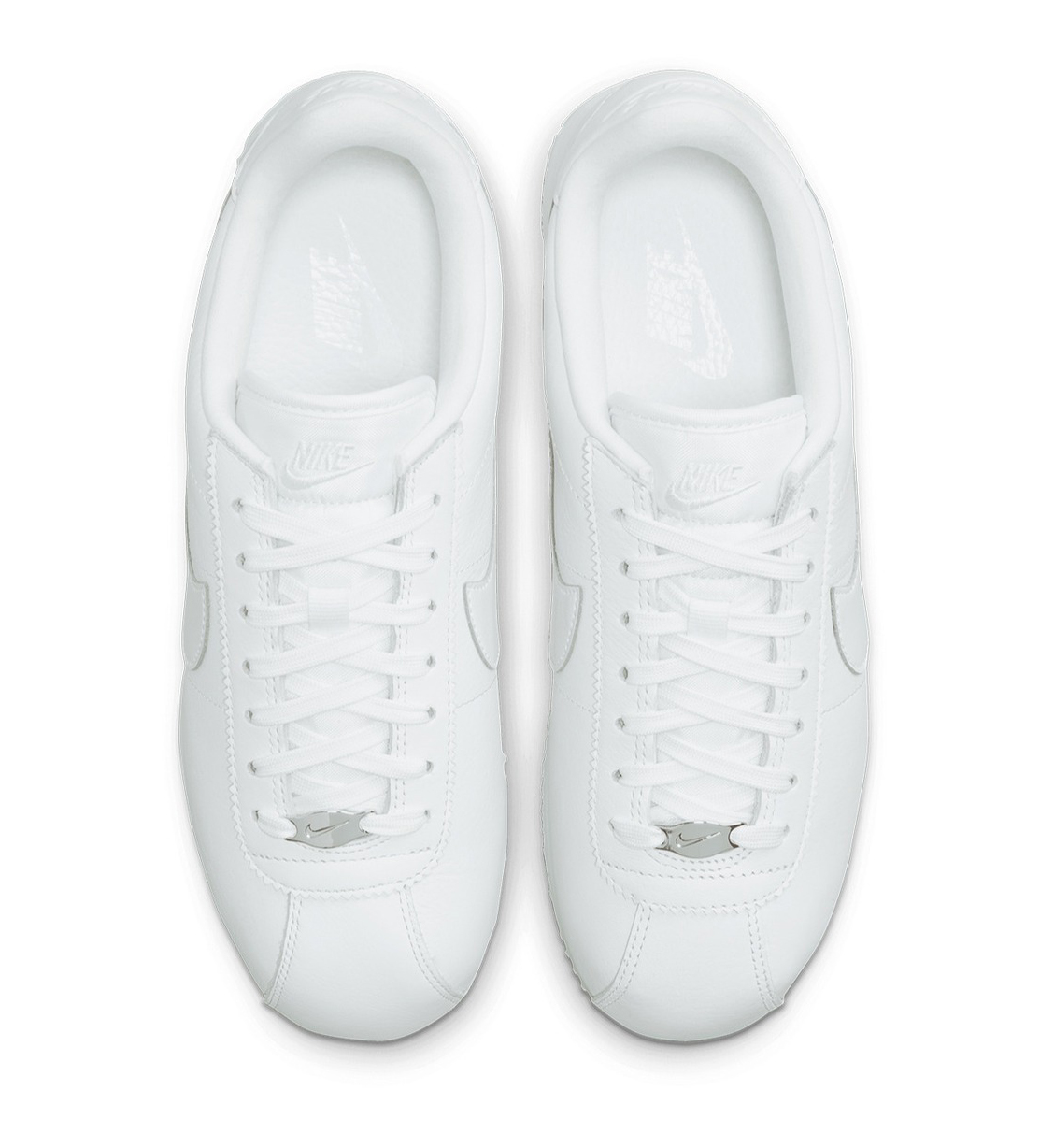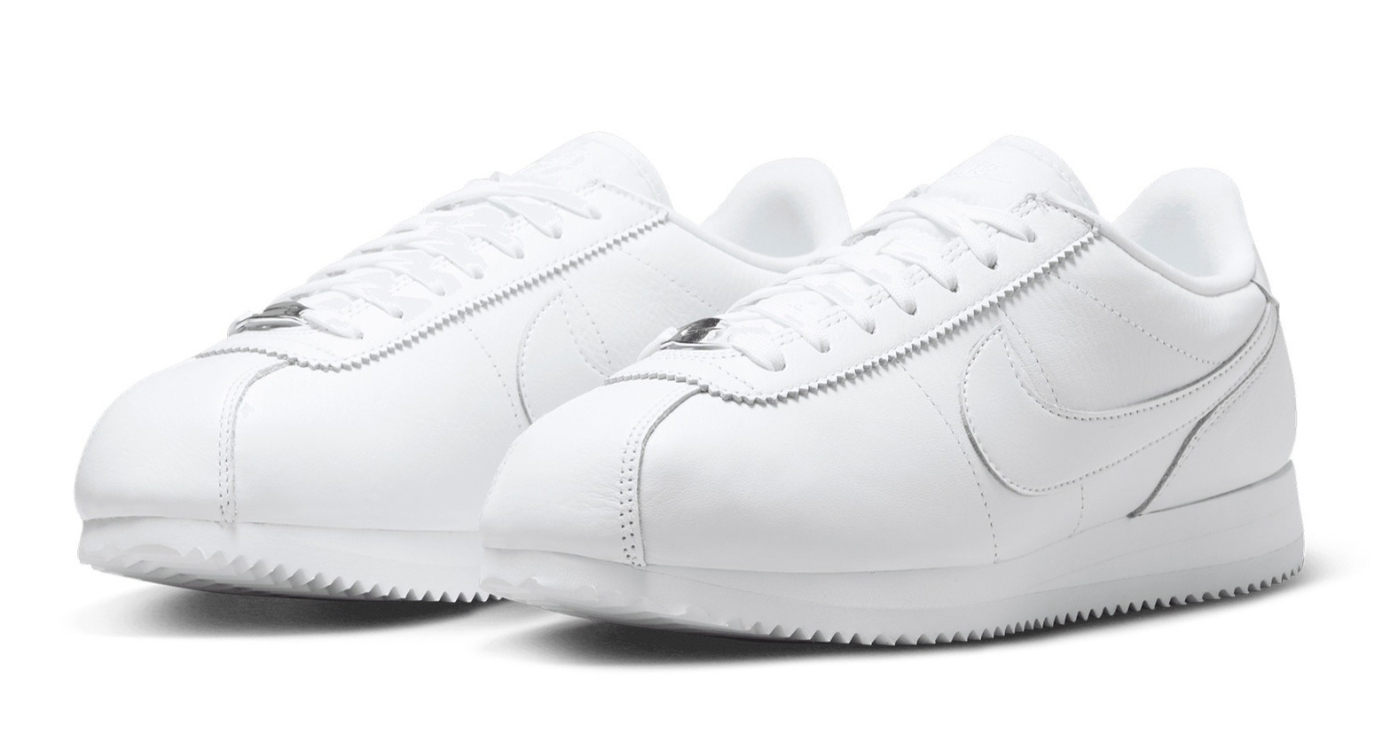 This Nike Cortez version comes in a clean all-white design made from high-quality leather. It includes comfy mesh tongues, eye-catching sharktooth edges, and stylish Metallic Silver lace dubraes, creating a sleek and harmonious “Triple White” look.