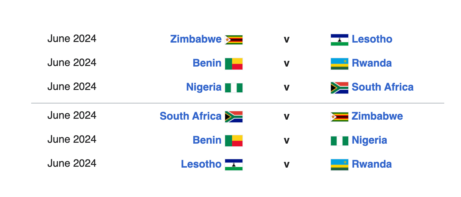 In Group C, South Africa is joined by Benin, Nigeria, Rwanda, Lesotho, and Zimbabwe, participating in a round-robin format where each team plays home and away matches against the other teams in the group.