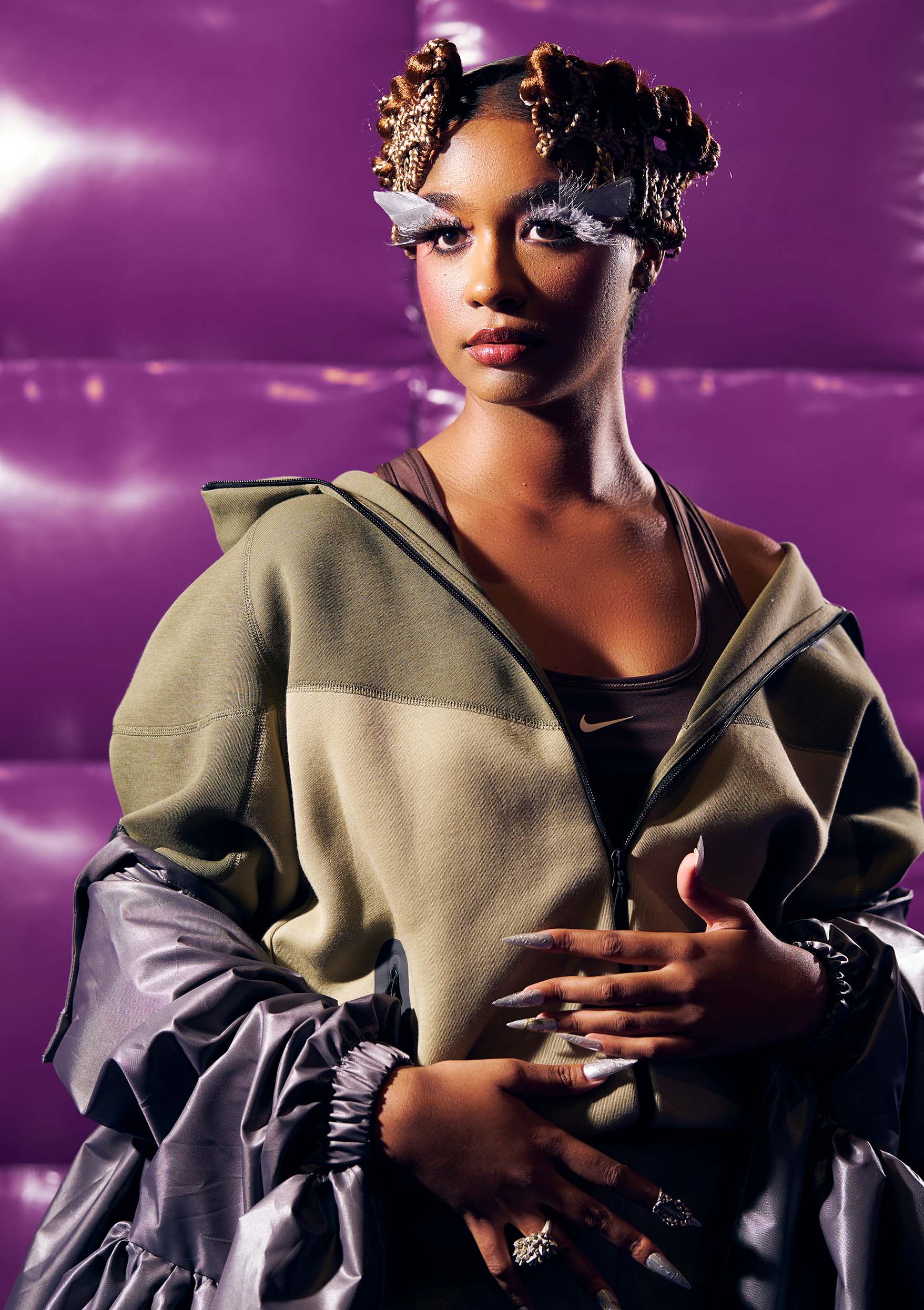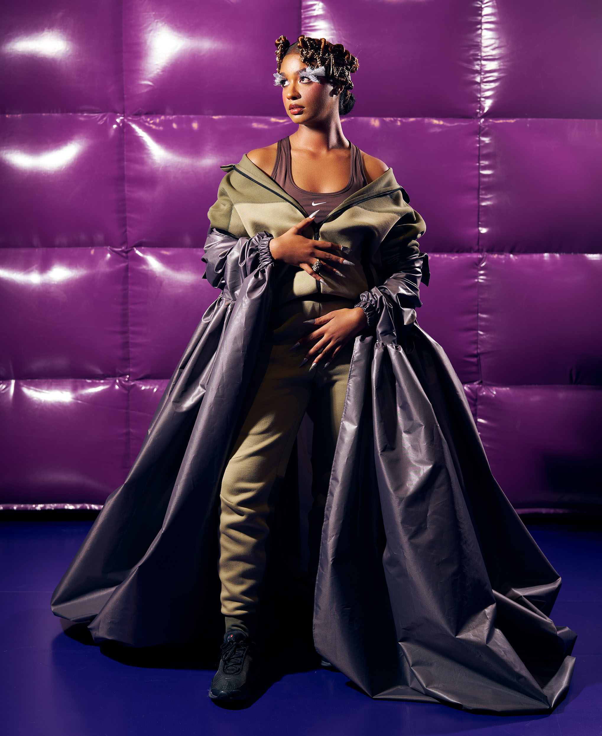 In creative synergy, Hair by Blackrose also took inspiration from the elements — creating a look “inspired by the story of a Zulu goddess who is known to be a shapeshifter and has many names”. The goddess’ ability to travel between bodies of water, by taking to the sky, echoes Serati’s buoyancy. “It speaks to the ability to adapt in a new environment and thrive outside your comfort zone — a power that we all have within us, that has the ability to take us from the deepest of waters, through pressure, into the highest of stratospheres. This is what Dynamic Air means to me”, she explained.