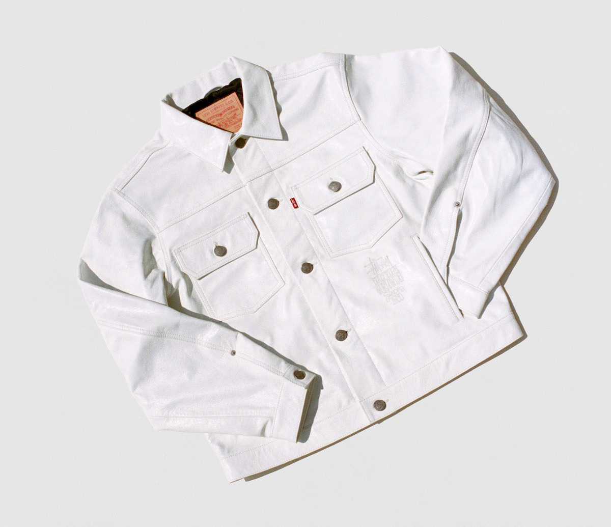 Crafted from white Italian leather, the leather jacket comes in a slightly cropped, boxy fit and features an embroidered Stüssy stamp bearing the slogan “Built Tough Worldwide Since 1980,” enlarged co-branded button shanks, and a custom two-horse pull patch with the Stüssy script logo. Inspired by classic Western wear, the leather belt is offered in a tan colorway and features embossed branding with black paint detailing.