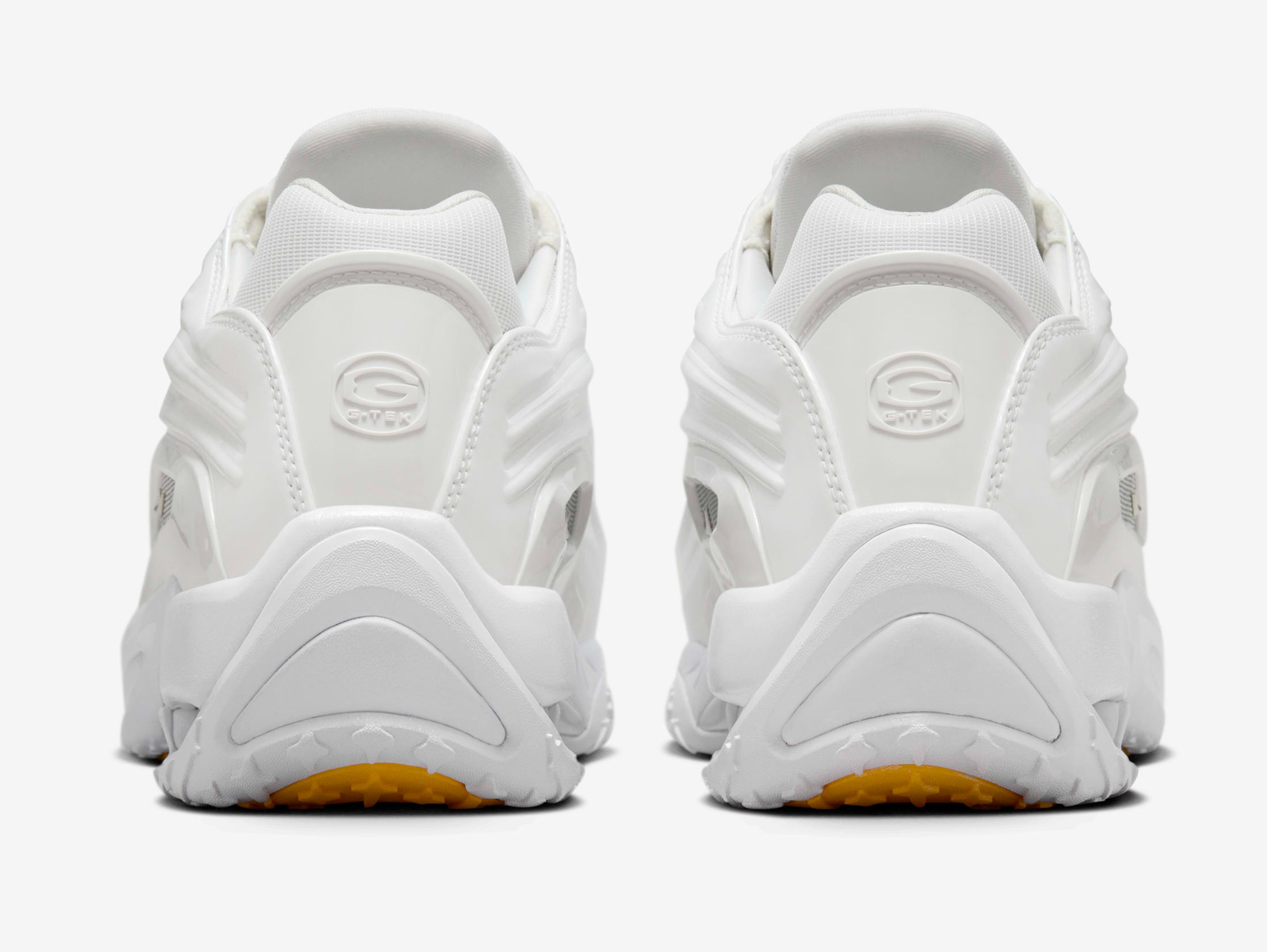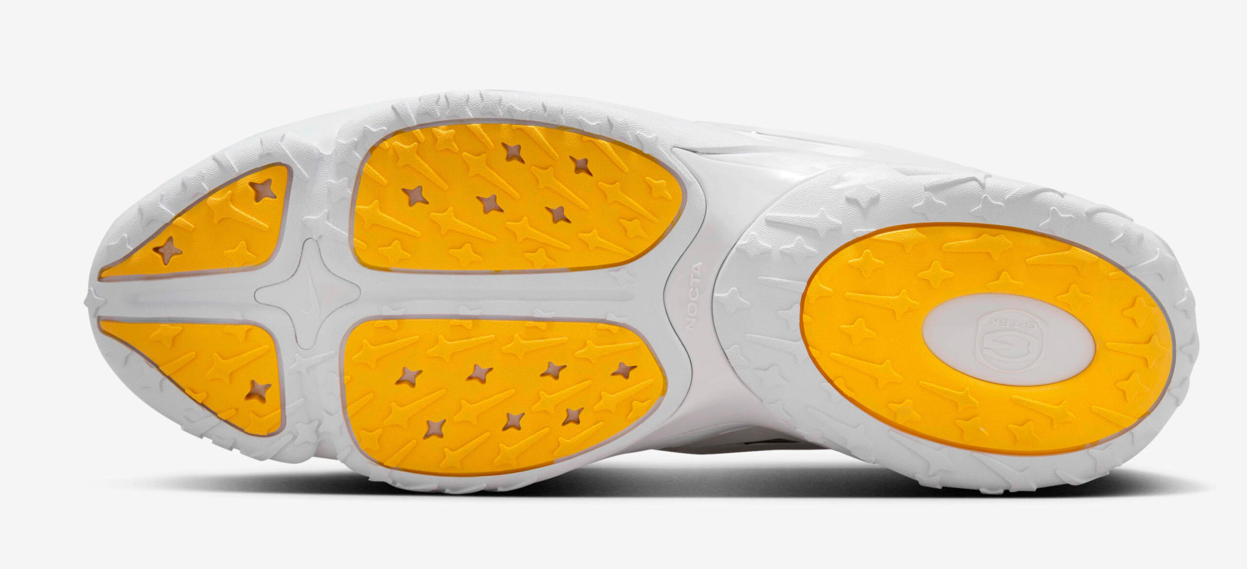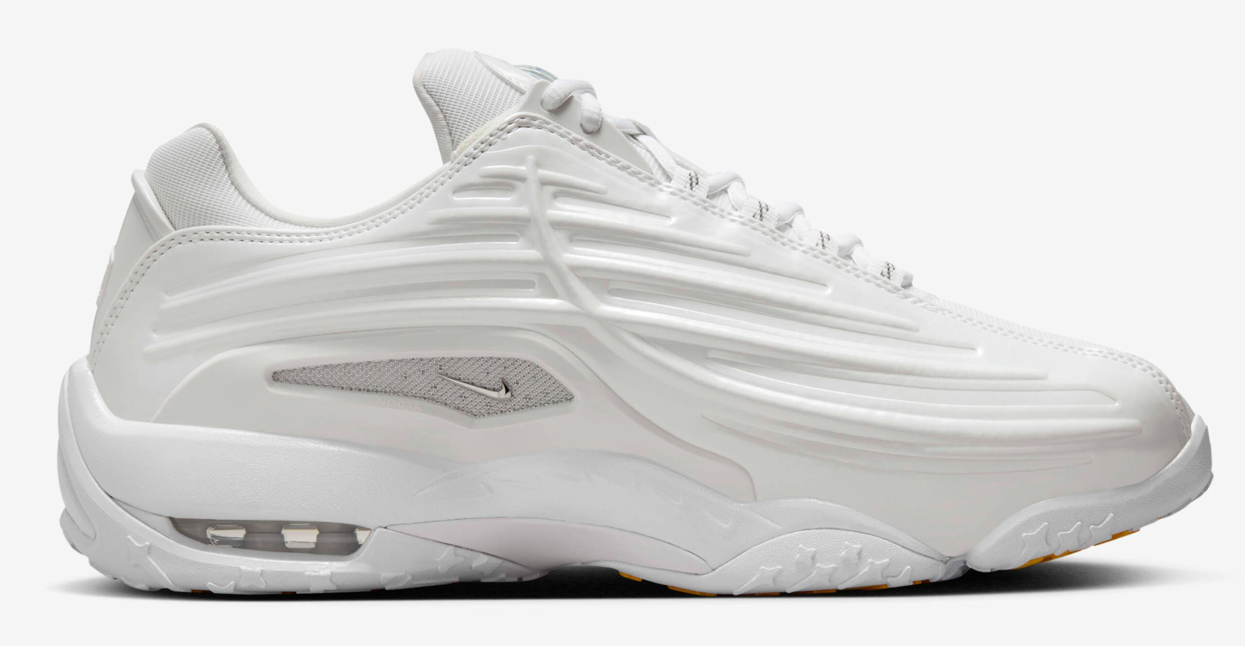 Inspired by 1990s turf trainers and basketball shoes, this model comes in a clean white color scheme. The latest release blends breathable mesh and synthetic leather overlays for a futuristic look, accentuated by chrome details for added elegance and NOCTA branding on the tongue. The foam midsole with air cushioning ensures both style and comfort.