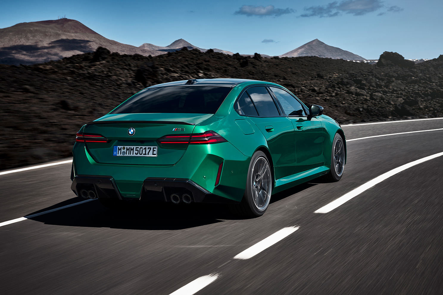 The exterior design of the new BMW M5 showcases its high-performance nature. It features prominent wheel arches, side skirt extensions, a sculptural front apron, and unique surfacing around the C-pillar, complete with an embossed “M5” logo. These elements not only enhance its athletic look but also distinguish it from the standard BMW 5 Series Sedan. The use of body-coloured surfaces adds a sleek and stylish touch, highlighting the car’s dynamic capabilities.