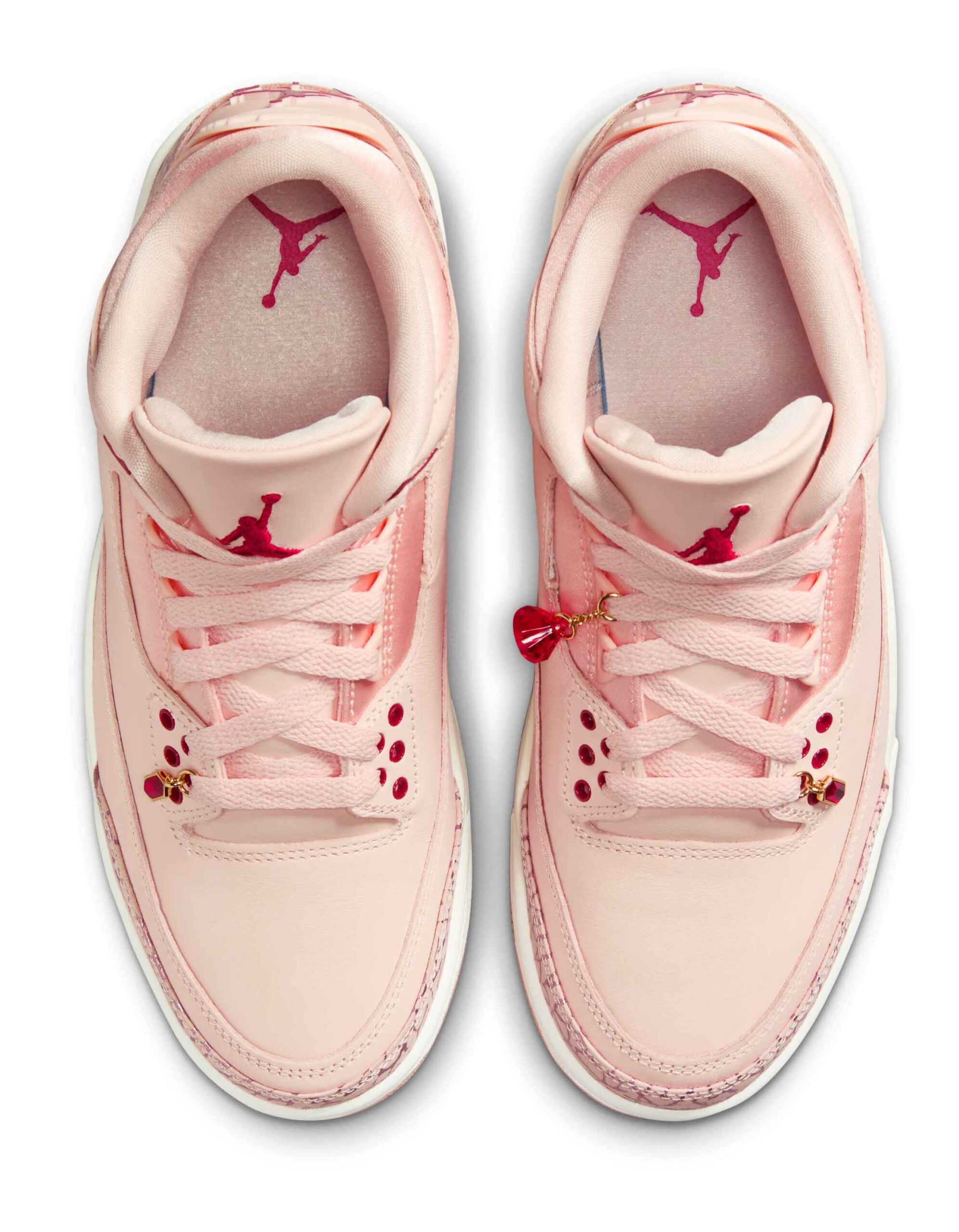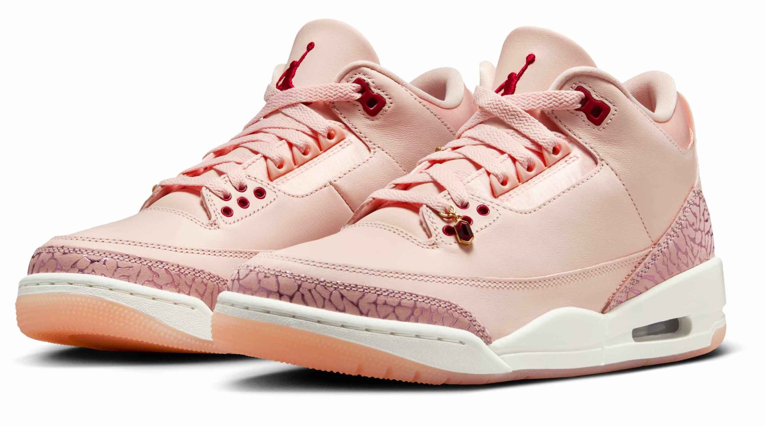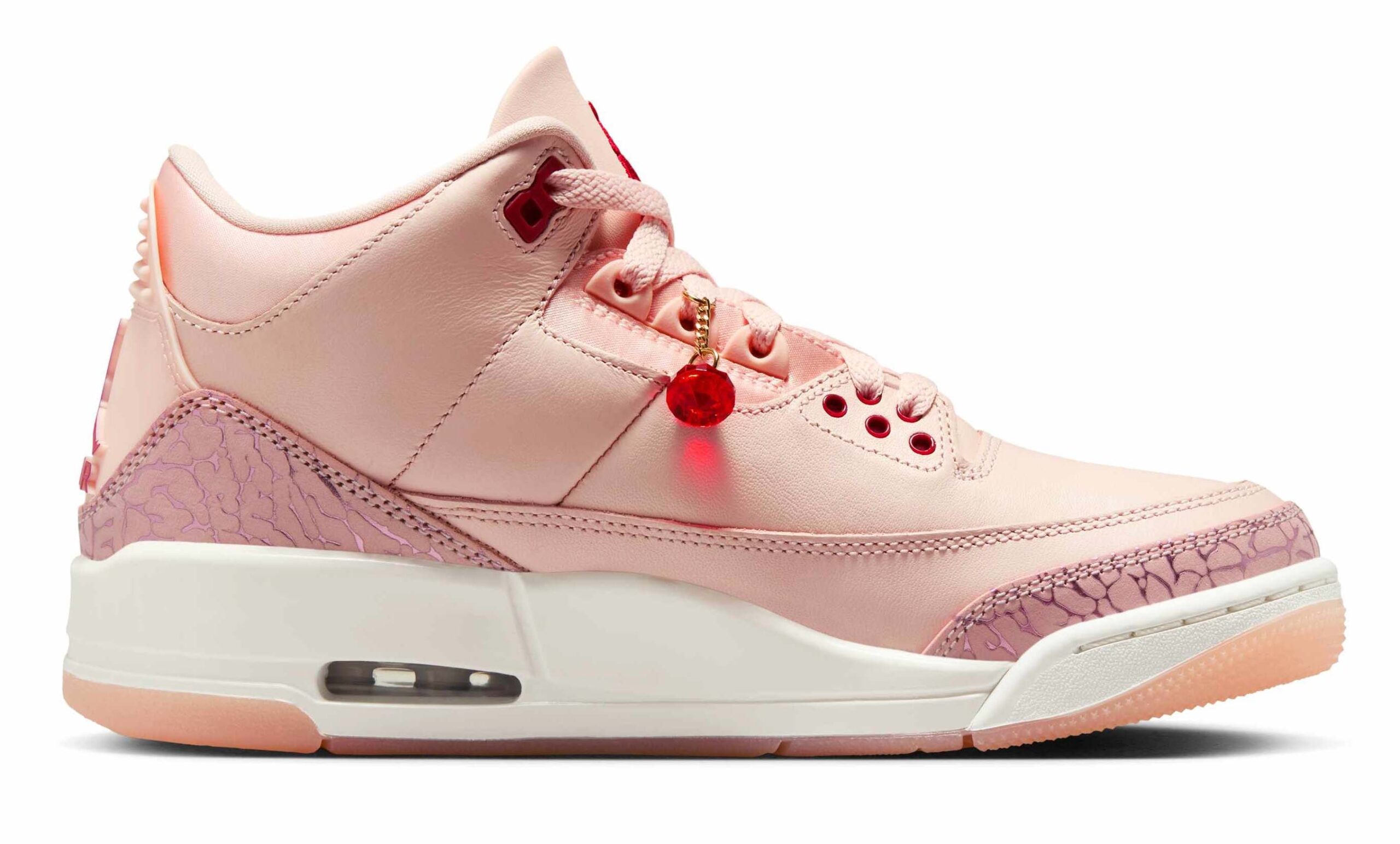 This special Valentine’s Day edition of the Air Jordan 3 celebrates love with a blush pink leather upper, swapping the usual cement grey for pink elephant print accents. Red highlights appear in the Jumpman logos on the heels, embroidered details on the tongues, and the eyelets. Satin ankle collars, ruby lace jewels, and translucent pink soles add extra flair, while the white midsole keeps it fresh. Packaged in a striking red box, with heart-covered tissue paper wrapping, these kicks are ready to steal hearts.