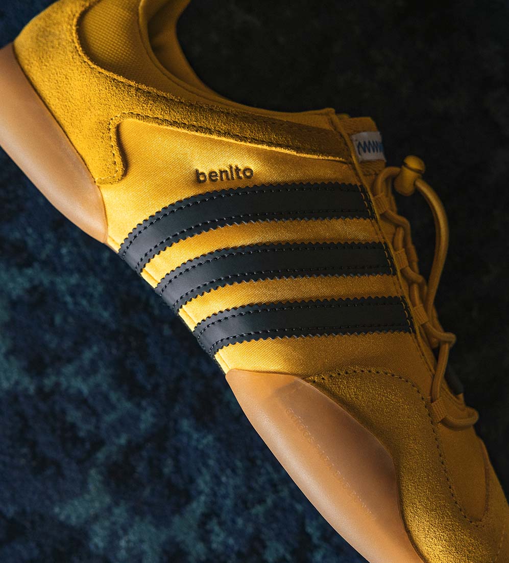 This model arrives in a vibrant gold color scheme, reflecting Puerto Rico’s dance culture and Bad Bunny’s artistic evolution. Design touches incorporate premium suede overlays on the toe and heel, enhancing its texture, while a streamlined shape and bungee-cord laces offer a secure, contemporary fit. The sneaker also features unique “Benito” branding near the signature Three Stripes and a special sizing tag on the exterior, serving as a tribute to his past adidas collaborations.