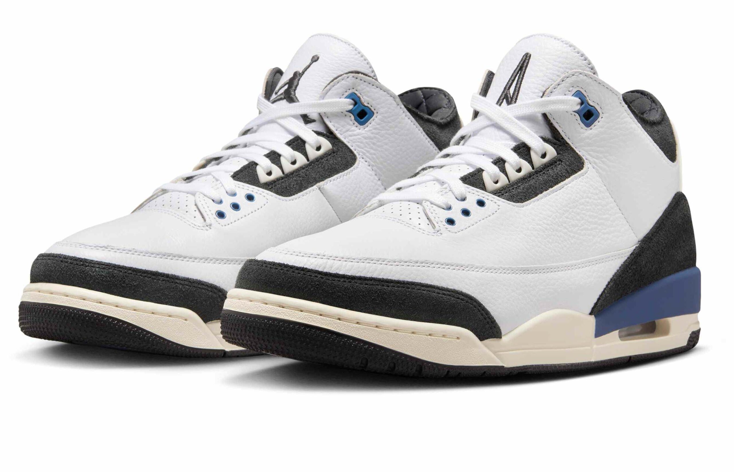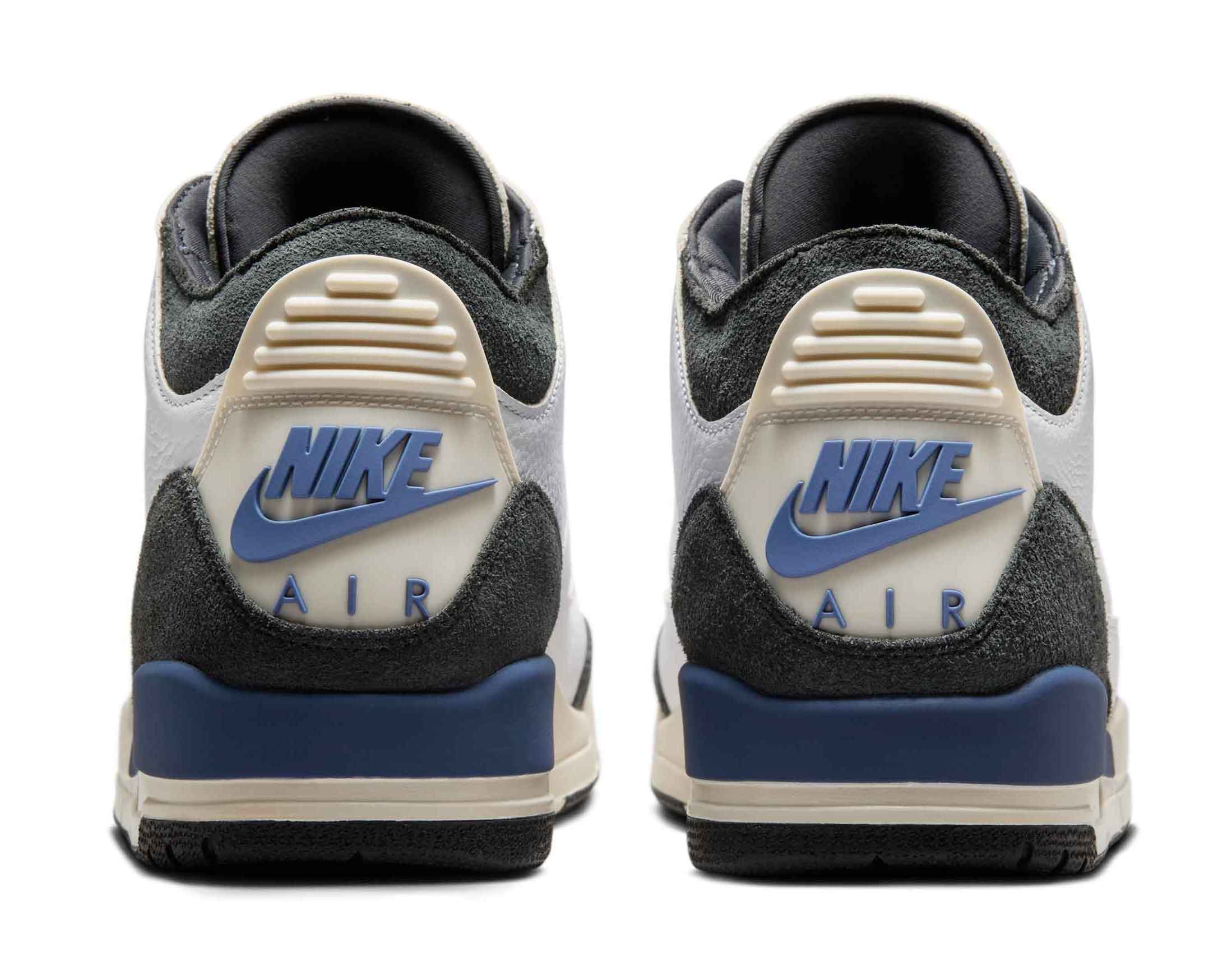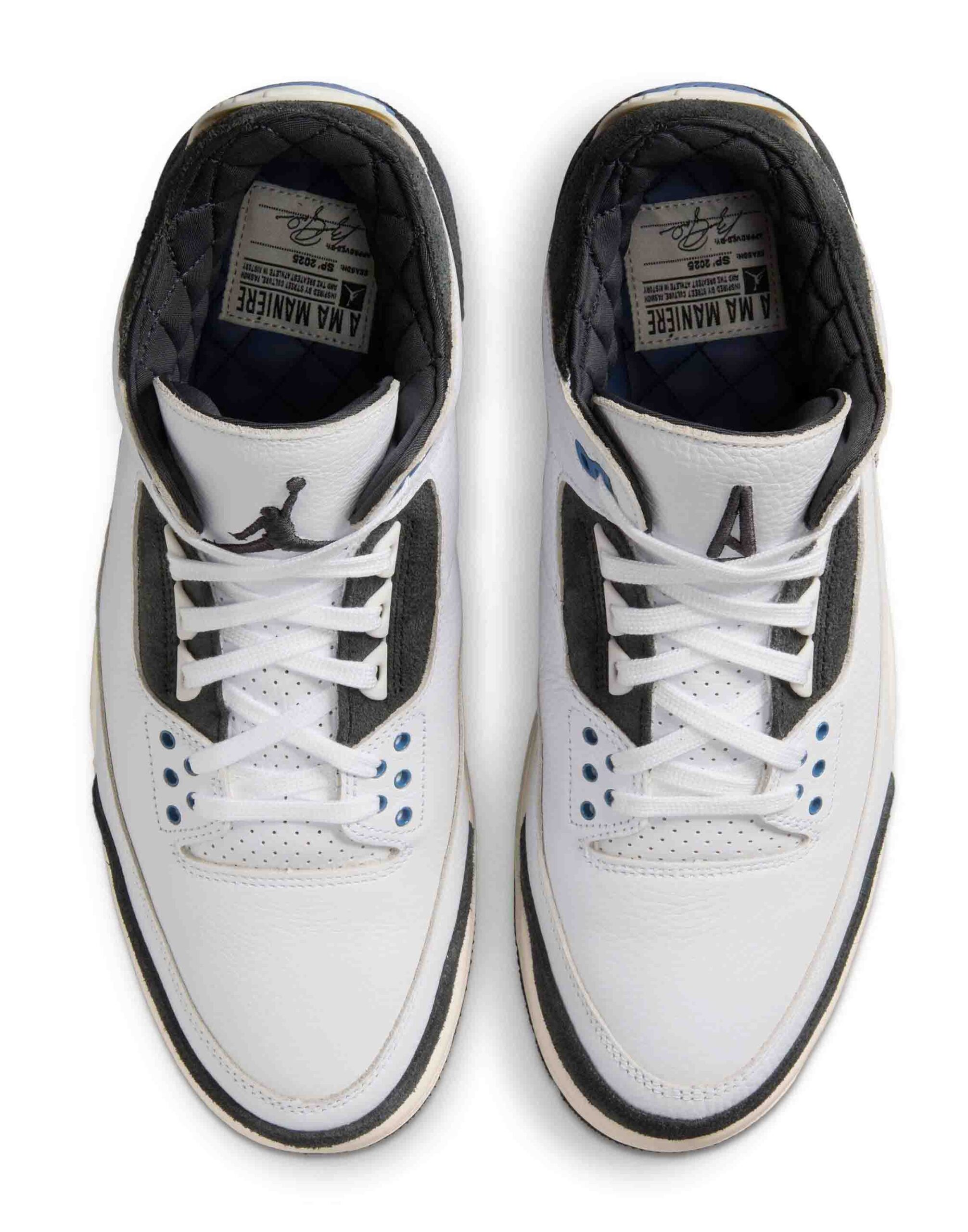 A Ma Maniére’s AJ3 features a premium white leather upper paired with Anthracite shaggy suede overlays for added depth and texture. Soft blue accents highlight the design, while co-branded tongues showcase the signature Jumpman logo opposite A Ma Maniére’s iconic “A” logo.