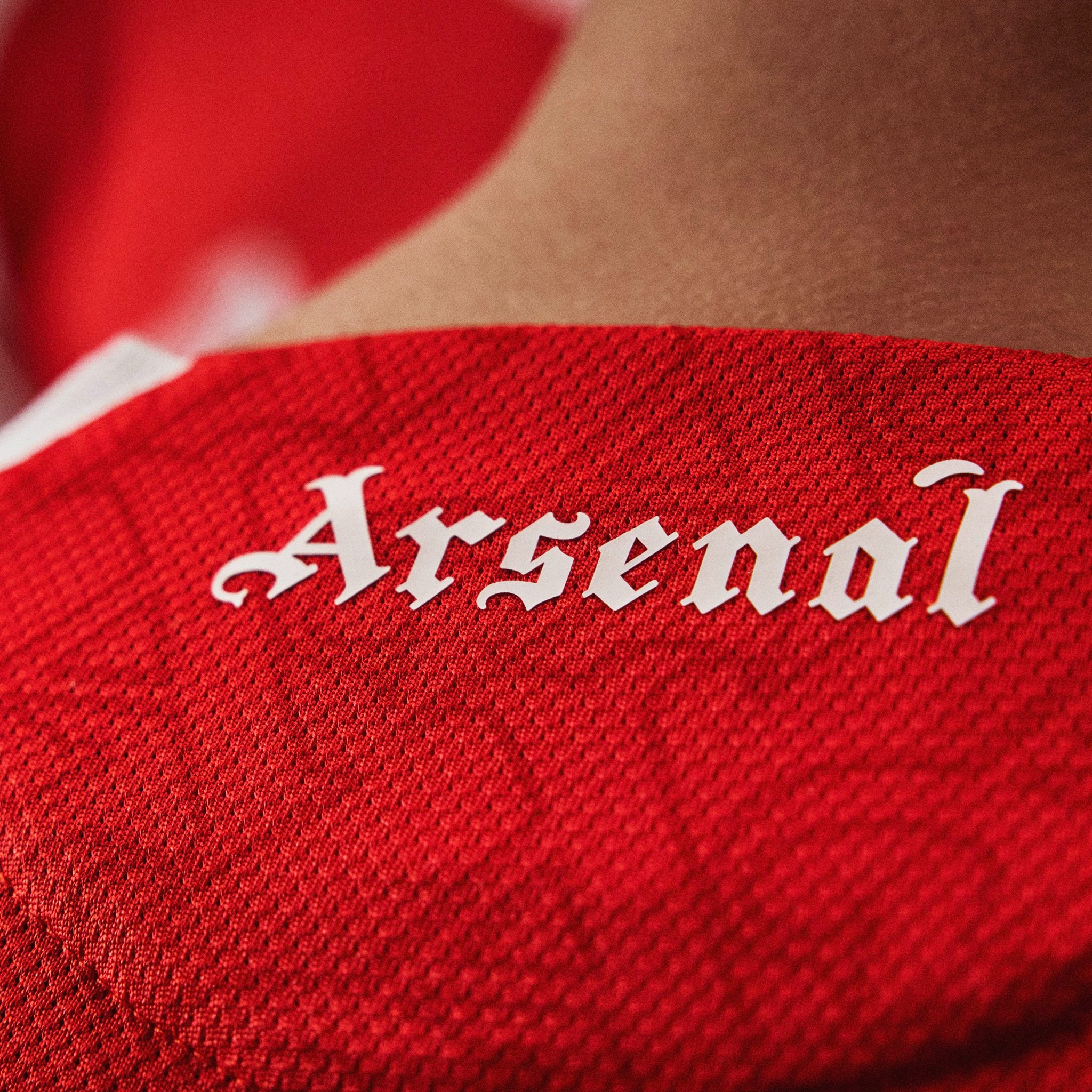 Taken from the ‘Victoria Concordia Crescit’ crest, first seen on matchday programmes in the 1949/50 season, the ‘A’ of ‘Arsenal’ is rendered in a gothic font and features as a repeating print throughout the shirt.